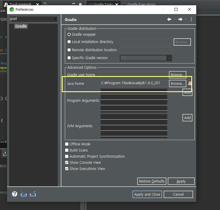 Window => preferences => gradle 입력.