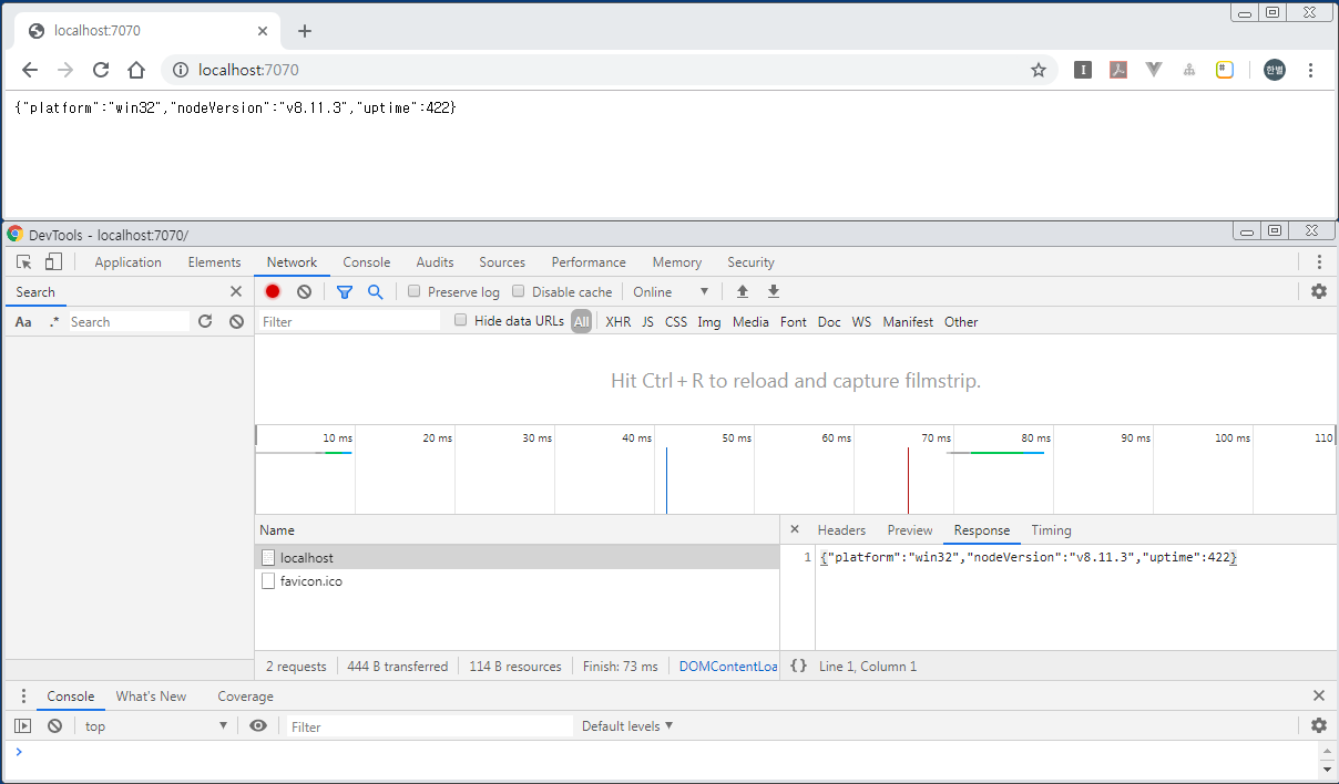 브라우저를 이용하여 http://localhost:7070에 방문하게 되면 서버가 출력하는 결과를 볼 수 있습니다.