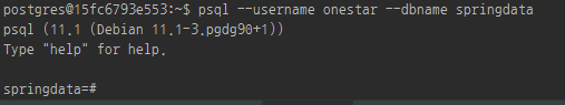 (위에서 저희는 POSTGRES_USER=onestar 라고 셋팅하여 postgres를 설치하였습니다.)