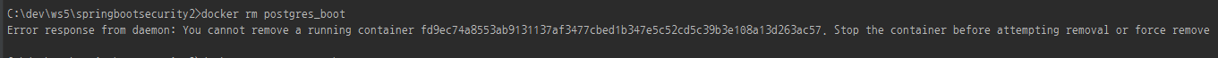 해당 컨테이너가 이미 running 중이기 때문에 삭제할 수 없다는 에러가 출력됩니다.