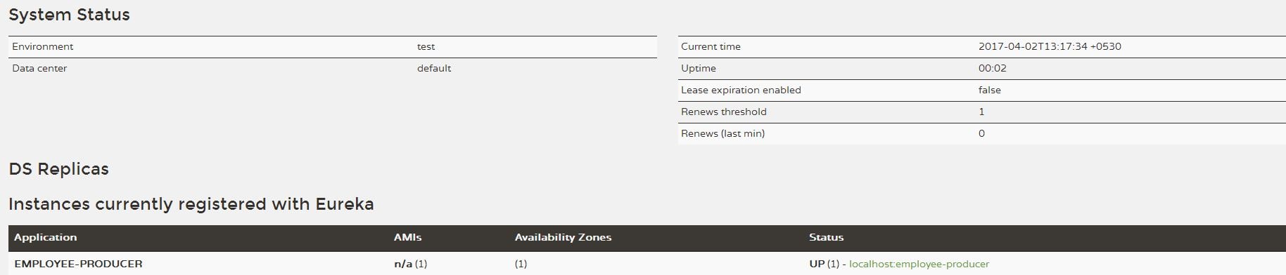 http://localhost:8761/로 접속하게 되면 eureka server에 employee-producer가 등록되어 있는 것을 확인할 수 있습니다.