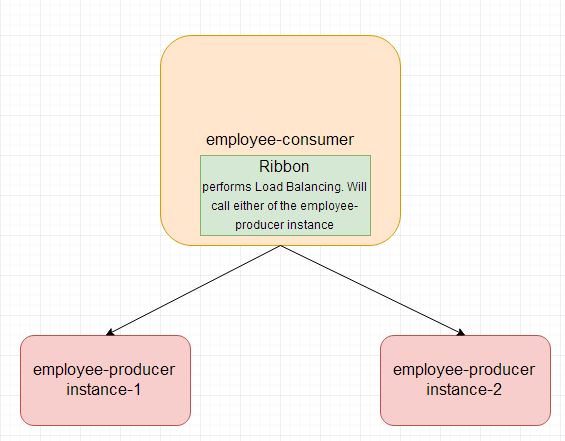 Ribbon(로드 밸런서)은 이제 내부 알고리즘을 사용하여 두개의 employee-producer 인스턴스 중 하나의 인스턴스를 호출하여 로드 밸런싱을 합니다.