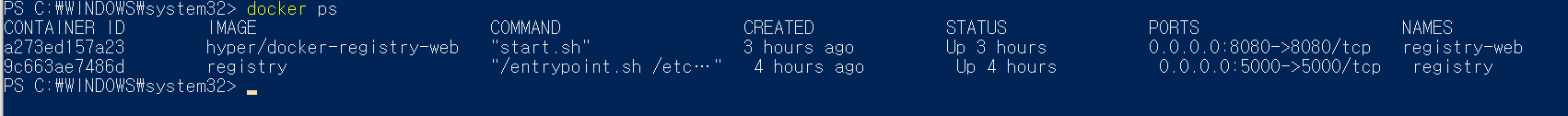레지스트리 컨테이너가 정상적으로 띄어졌는지 확인합니다.