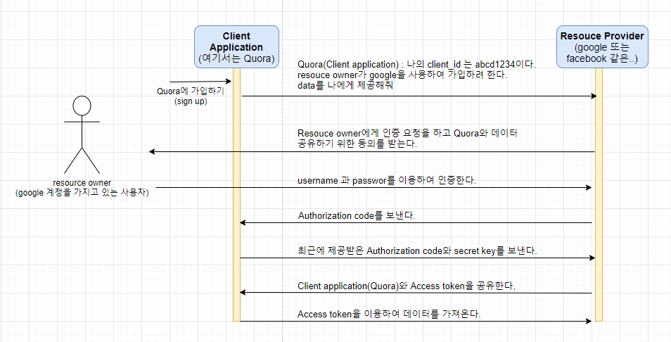 client application(여기서는 Quora)가 OAuth2.0을 사용하여 goole 간에 발생하는 인증 프로세스는 간단하게 아래와 같습니다.