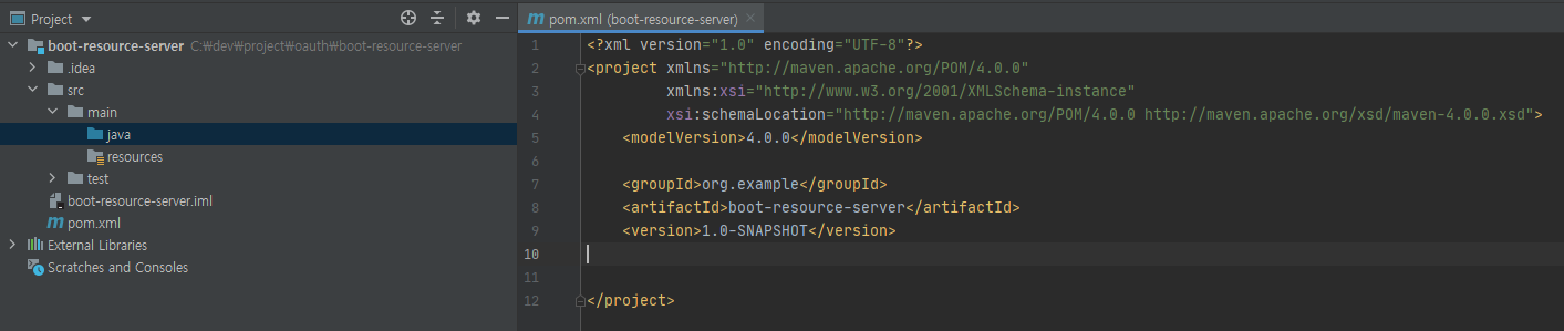 프로젝트 명은 boot-resouce-server이며 깡통 maven 프로젝트로 생성하였기때문에
