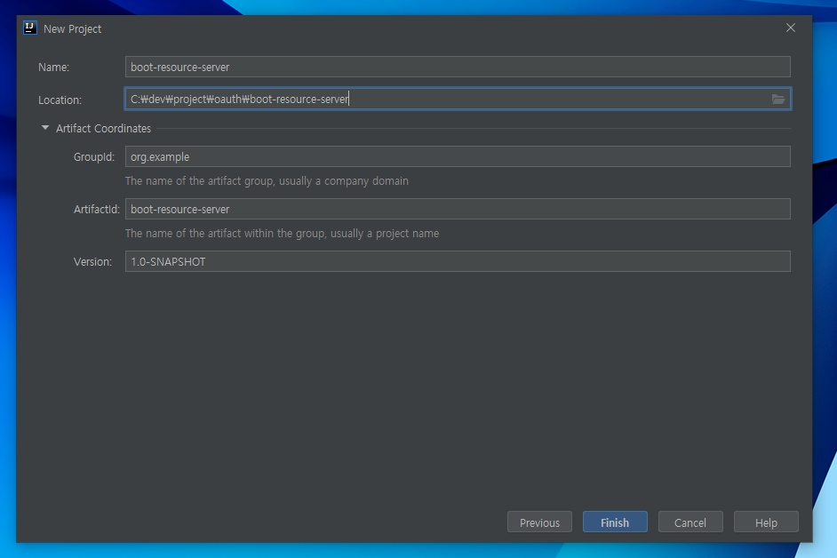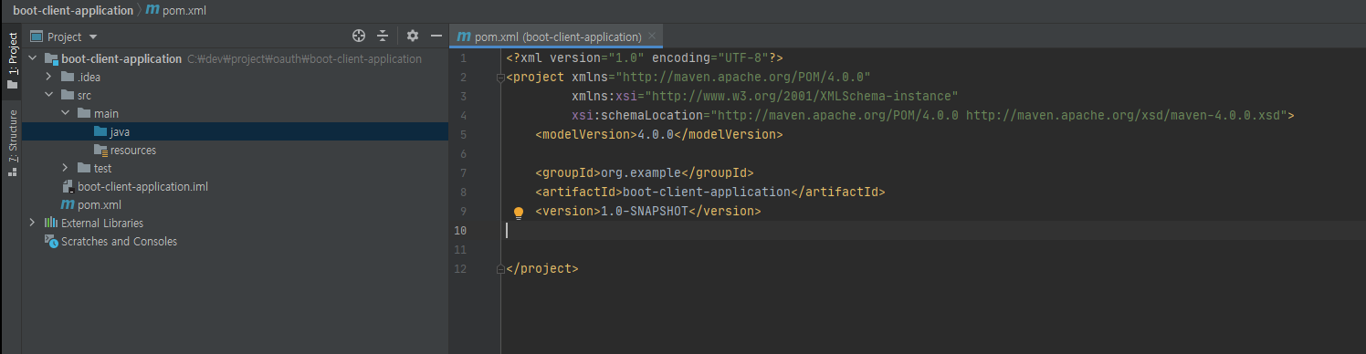 프로젝트 명은 boot-client-application, maven 프로젝트로 위의 Resource server와 동일하게 생성합니다.