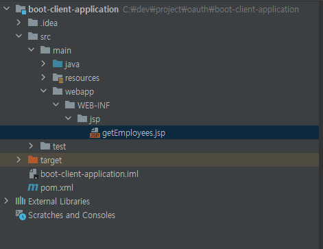 jsp파일을 생성하기 위해 webapp - WEB-INF - jsp 폴더를 순서대로 생성하고 getEmployees.jsp 파일을 생성합니다.