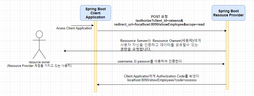 - Resource Server는 Resource Owner(사용자)에게 사용자 자신을 인증하고 데이터를 공유할수 있는 권한을 요청합니다.