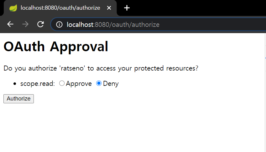 Approve를 선택 후 Authorize 버튼을 클릭하여 Client Application이 Resource를 접근할 수 있도록 권한을 부여해 줍니다.
