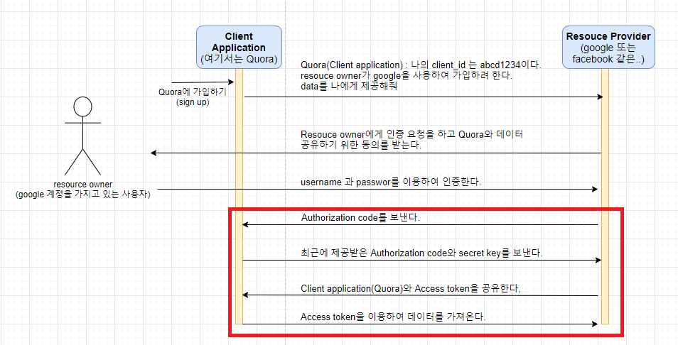 - Reourrce Server는 Resource Owner에게 자기 자신을 증명하고 데이터를 공유할 수 있도록 권한을 요청합니다.
