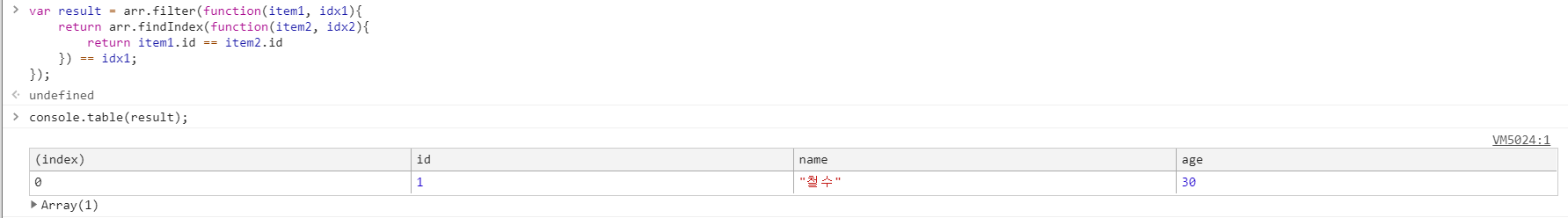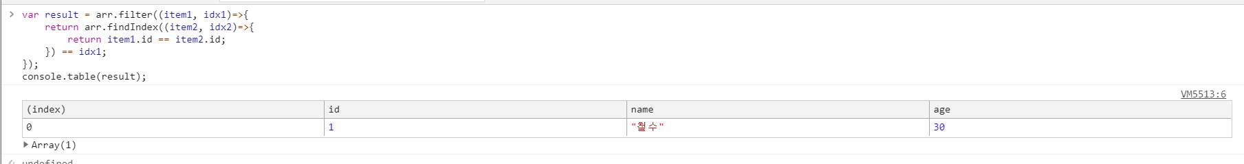 2. filter(), findIndex()를 사용하여 중복된 객체 제거. ES6 화살표 함수 사용
